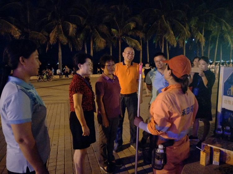 10月4日晚19时,海口市旅发委主任廖小平到假日海滩检查节日服务保障工作,秀英区人大主任刘小琴、海旅控股集团常务副总